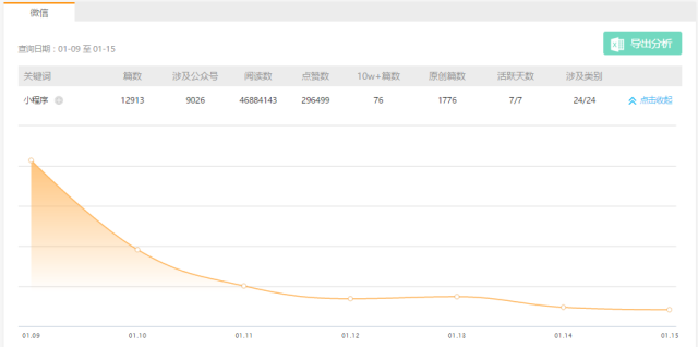 这是自媒体人望月昨天文章提出的一个疑问。截止今天,距离1月9日小程序上线一周过去了。据新榜文章搜索功能统计,1月9日当天,仅标题中提到“小程序”的公众号文章就有3312篇,其中24篇10w+,无论是看好亦或唱衰,小程序都在当天强势占领了我们的朋友圈和微信群。